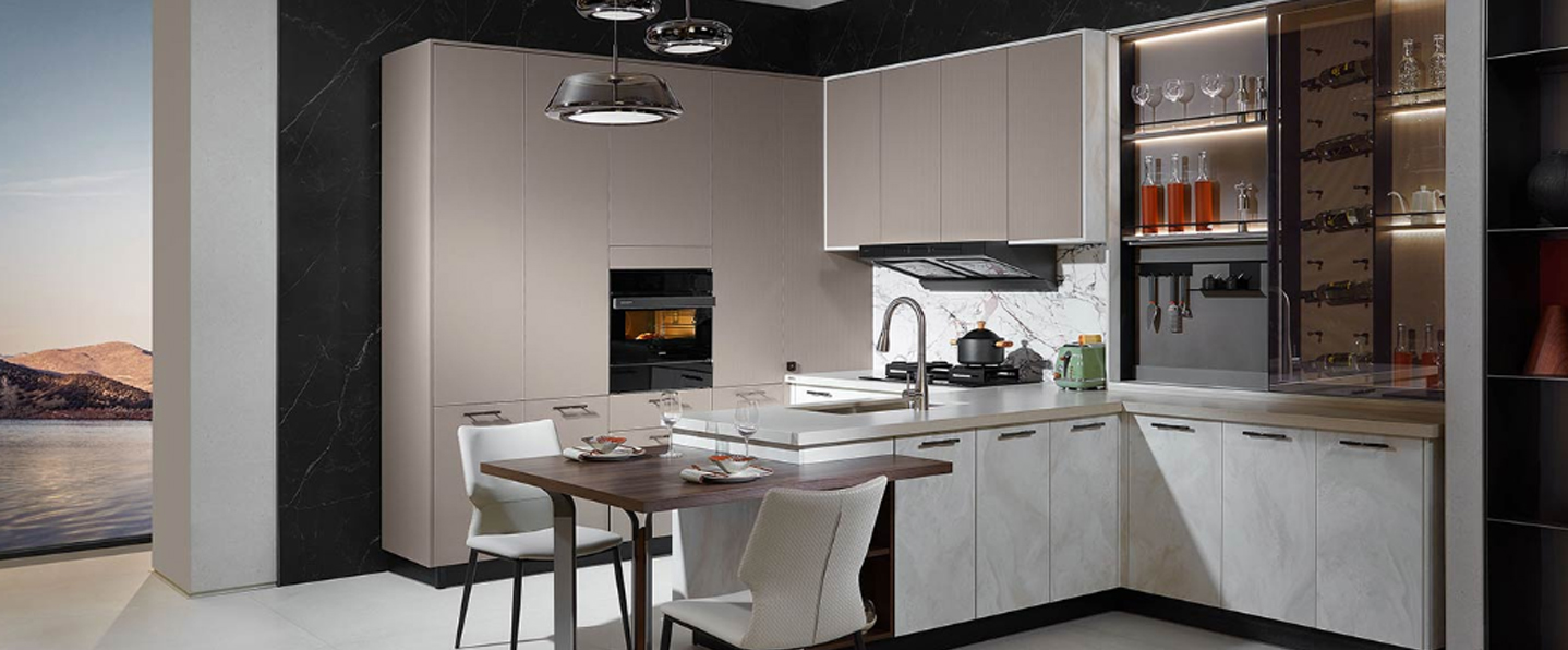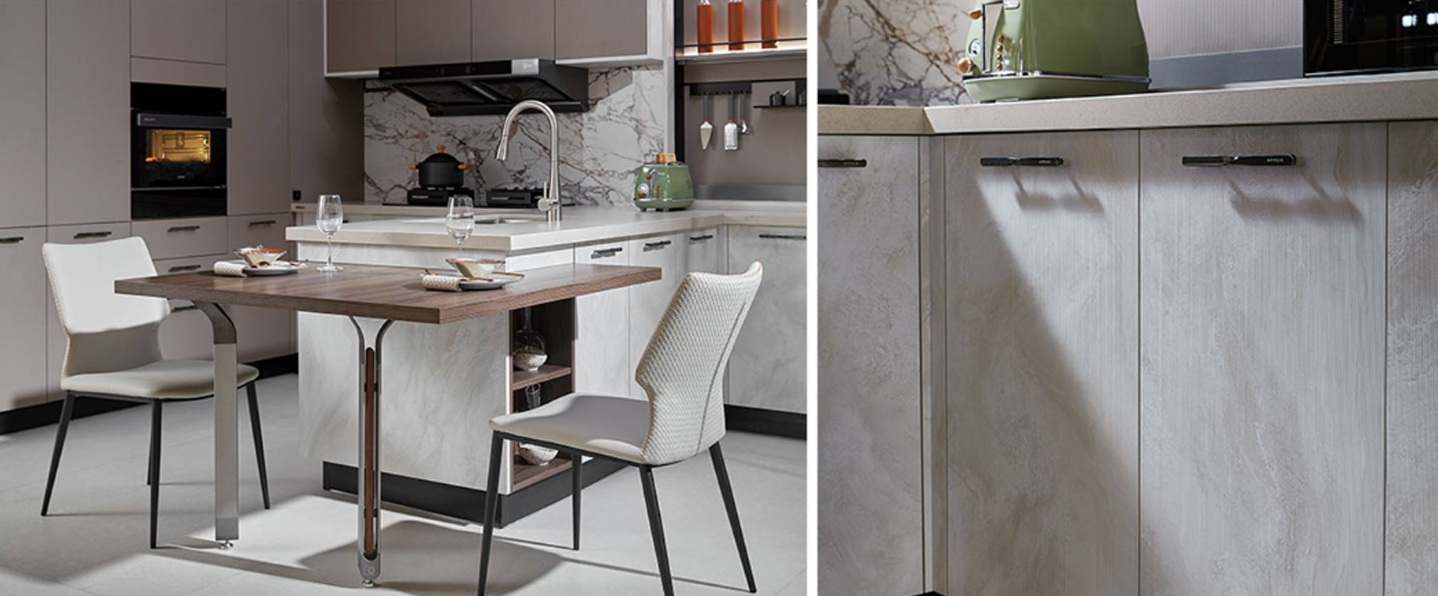Kitchen Cabinet Design Concept: Minimalism does not equal simplicity. The simple lines of the kitchen cabinet CAMON can also greatly enrich the visual experience. The atmospheric stone patterns and lines are integrated into one, exuding a natural beauty. This new custom kitchen cabinet in 2022 uses 3D embossed imitation jade door panels to bring the visual effect of natural beautiful jade. The vertical stripe elements are used in harmony, and the silver thread is combined with the cloth pattern, which is stable and timeless. The design of the glass sliding door makes the whole kitchen space clear, and the light and shadow are interlaced.