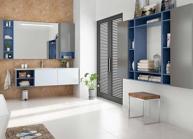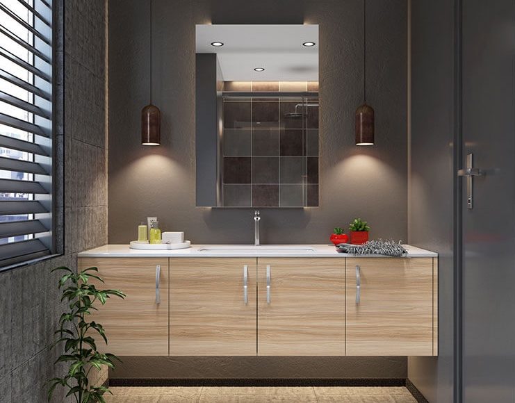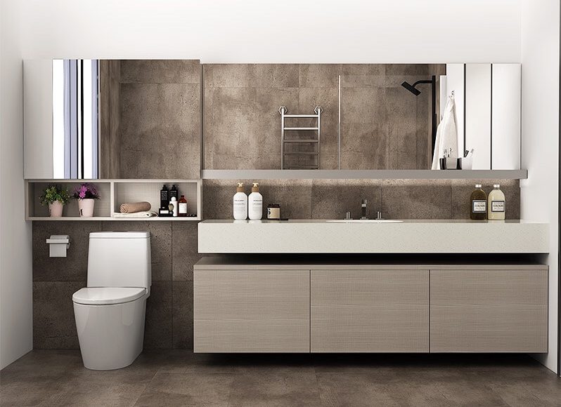 As one of the best bathroom vanity wholesalers in China, we offer this toilet cabinet with mirror. A custom mirrored cabinet bathroom is a great way to save space. Here you’ll get handy storage and a convenient mirror combined into one. The wood grain customized bathroom vanity is matched with brown walls, and the embellishment of white and beige countertops makes the whole bathroom cabinet with light highlight the high-quality texture. The mirrored doors on the wall extend the view of the light bathroom cabinet as a whole.
