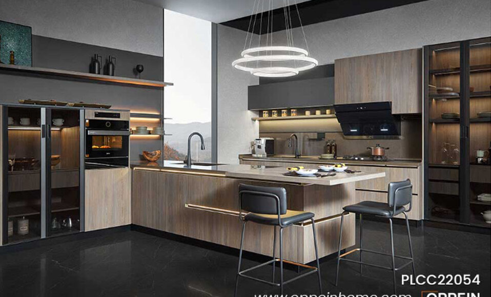 3. Color matching: The overall color of the cabinet is calm and advanced. Brown pine wood texture and gray triangular geometric texture door panels enhance the temperature of the space and reflect an unrestrained attitude. The lighting lines of the base cabinet create a sense of romantic atmosphere.