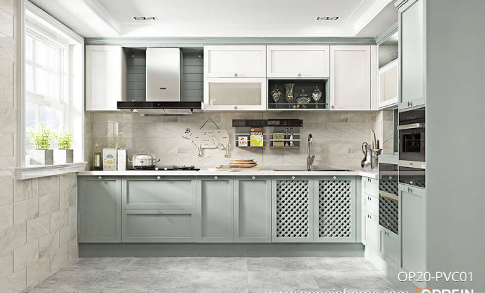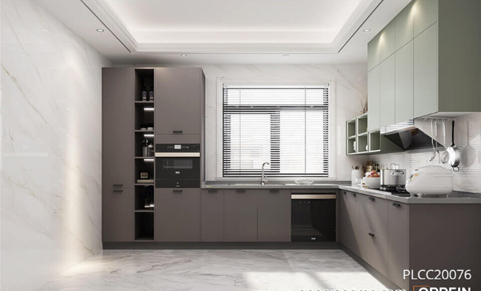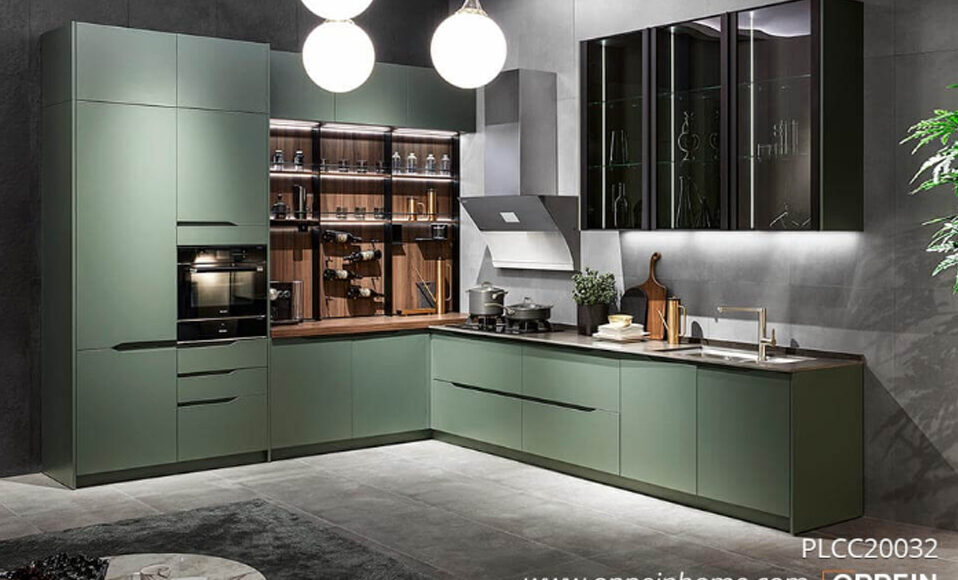 As the leading kitchen cabinet supplier, OPPEIN offers this L-shaped lacquer handless kitchen design in green color. The design of the unique curved door panel makes the handleless design difference. The combination of the green door panels and wood grain back panels captures the quintessence of the Scandi-industrial style perfectly.