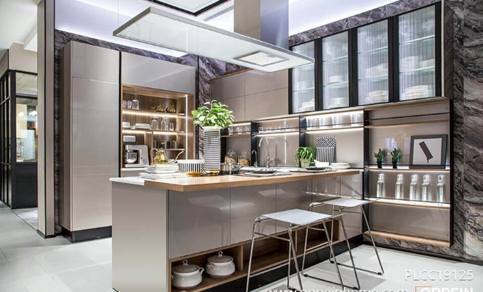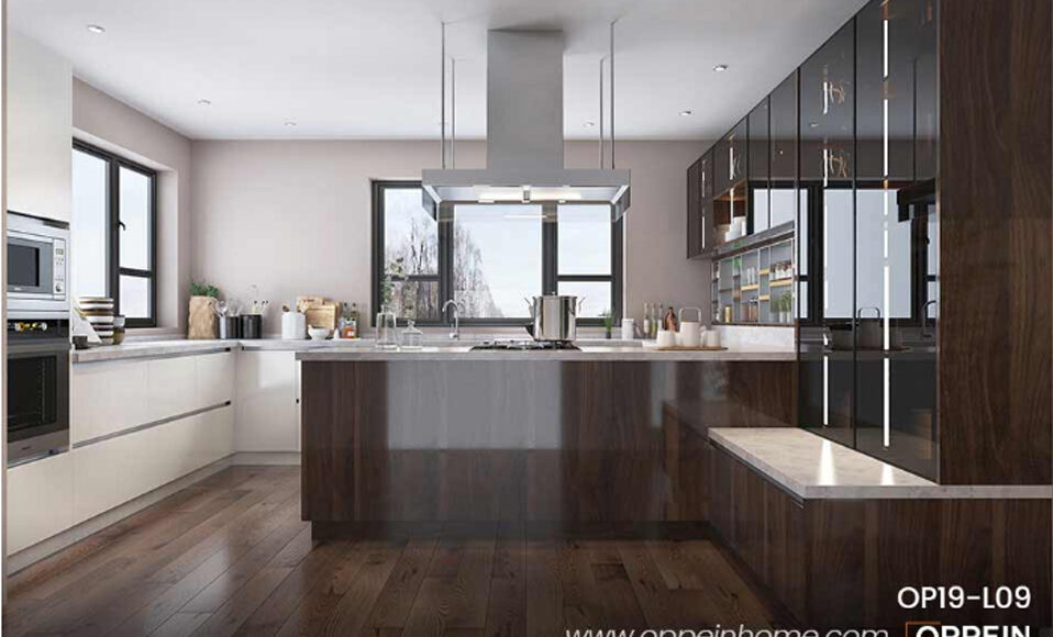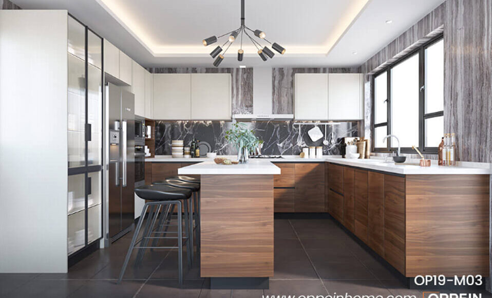 There is a work triangle in the U shaped kitchens. Kitchen users not only have a large working area in preparing food and cleaning dishes, but they can also easily interact with people outside the kitchen. The dark color is classical, eternal, high end and can be served for a long time. It creates a large workspace for one cook. The material of laminate has excellent performance in scratch and heat proof.