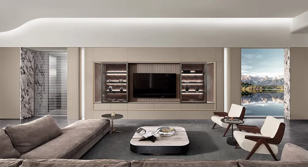 Ambient lighting can significantly influence modern living room decor by creating a warm, inviting atmosphere, which is essential for a relaxing and comfortable space. This subtle glow highlights architectural features and draws attention to specific areas, adding depth and height to the space. Additionally, it can change the color tone of the room, add a moody feeling, create shadows, and create a calming effect.