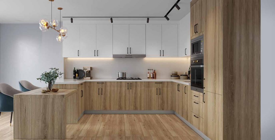 White lacquer provides a sleek and modern appearance to the kitchen. The glossy surface reflects light, creating an airy and bright atmosphere. It adds a touch of sophistication to the kitchen, making it feel luxurious and stylish. Also, wood grain cabinets add a natural and organic feel to the space. The unique grain patterns and textures mimic the beauty of nature. Combining lacquered cabinets creates a cozy and welcoming zone for precious family time.