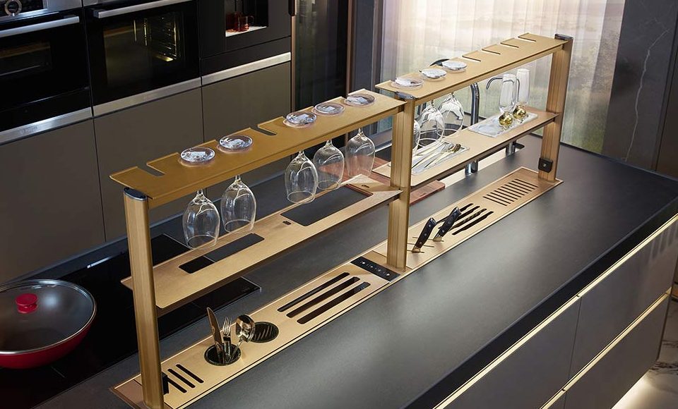 Set on the countertop of a kitchen island, this open shelf is glazed with an eye-catching golden finish. It serves as a drying rack for cutlery and glassware. This shelf is also a highlight in the kitchen. Glossy and shining, this open shelf adds an air of luxury to the kitchen. It shows off the owner’s good taste.