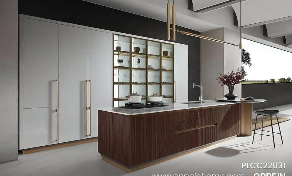 Solid wood is an excellent choice for high-end kitchen cabinets, as it is the most valuable material. This kind of natural masterpiece speaks for itself, such as the fluted wooden island in the picture. With the addition of the super-large island, the kitchen has achieved a new level of elegance. Are you considering a luxury kitchen design? Solid wood is a wise choice if you have the budget.