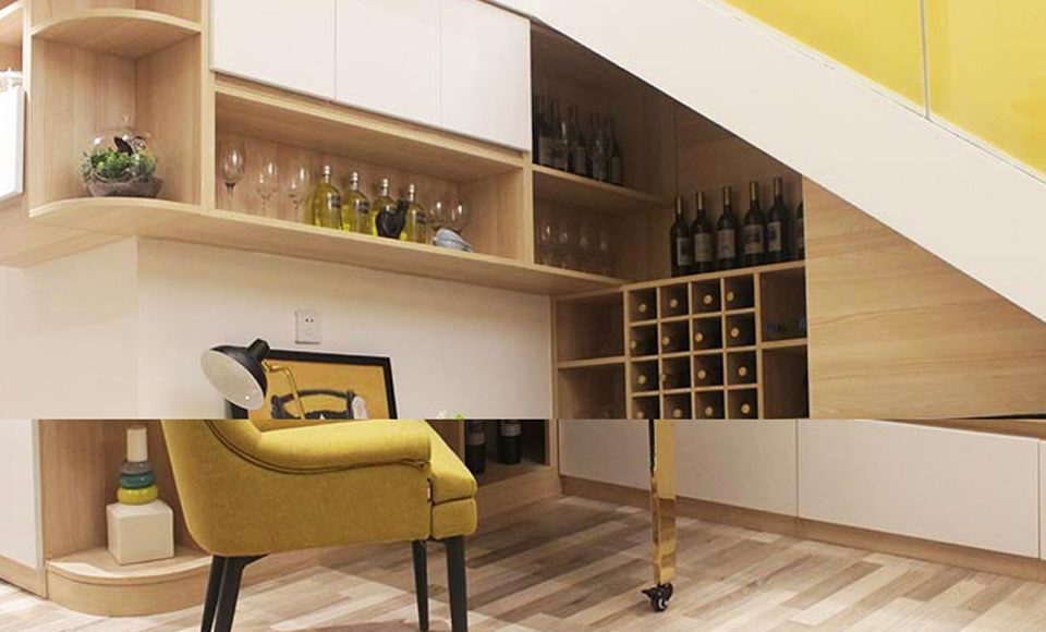 There is always a way to explore the possibilities of storage space in a house, for instance, on the staircase. Check out these open shelves on the wall and under the stairs. Every inch of the room was maximized and optimized. The wall mount shelving is arranged as modular cubes, providing an aesthetic appearance as well as excellent storage capacity.
