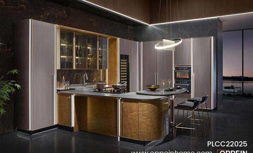 This European-style kitchen cabinet set the market trend thanks to its luxurious customized veneer and distinctive hardware. These new kitchen cabinets use noble wood veneer as their score and passionate abstract art as their soul. A classy and understated nocturne is produced in your kitchen when the two are combined.