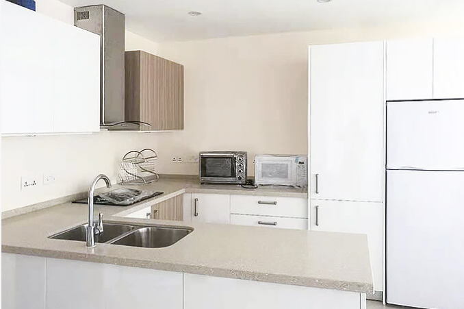 Full Kitchens, including stove, fridge, cabinetry, hot water, toaster, coffee maker and all utensils. The main cabinet finish is high gloss white laminate and wood grain laminate, the countertop is consists of Quartz stone.